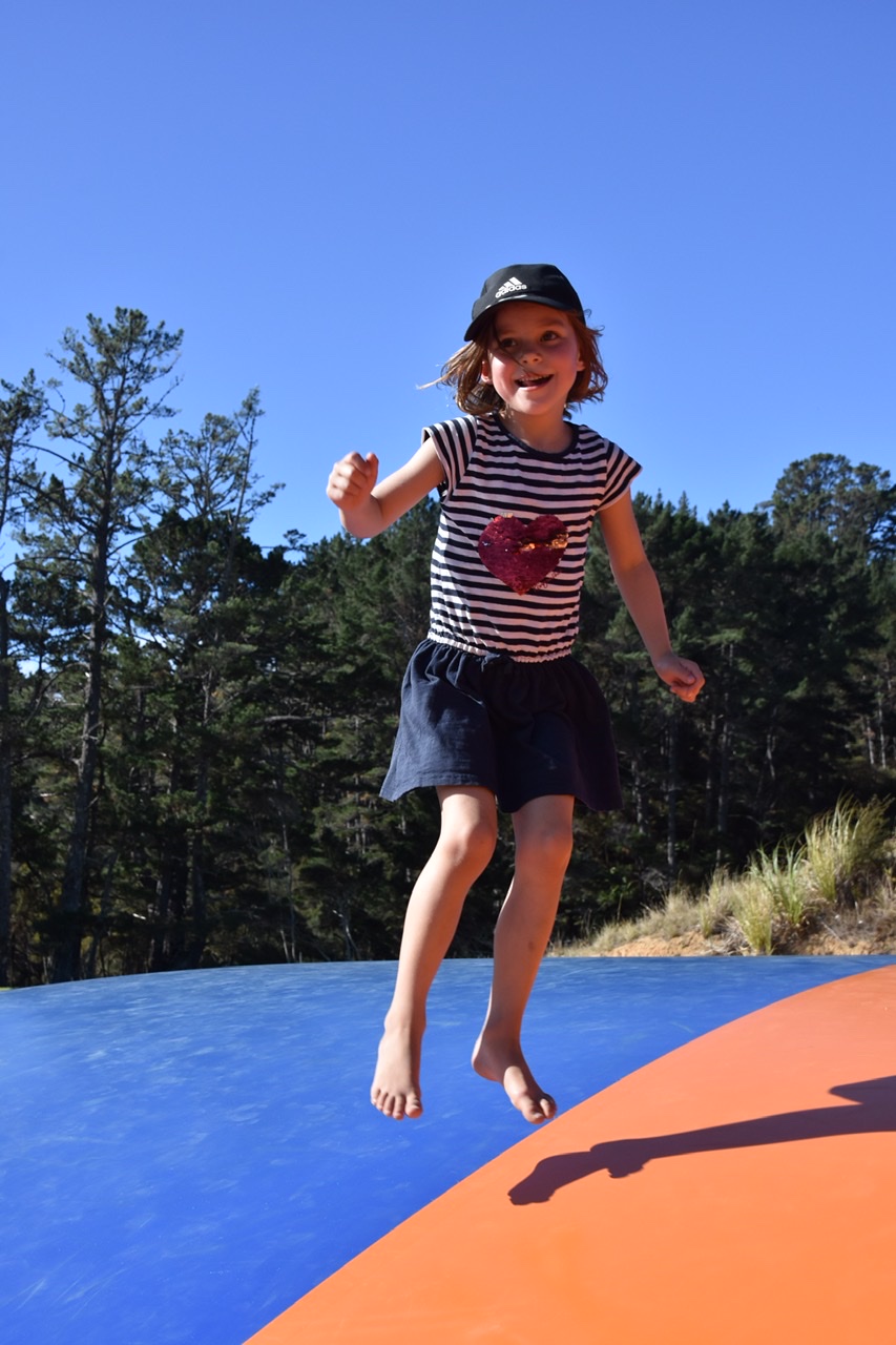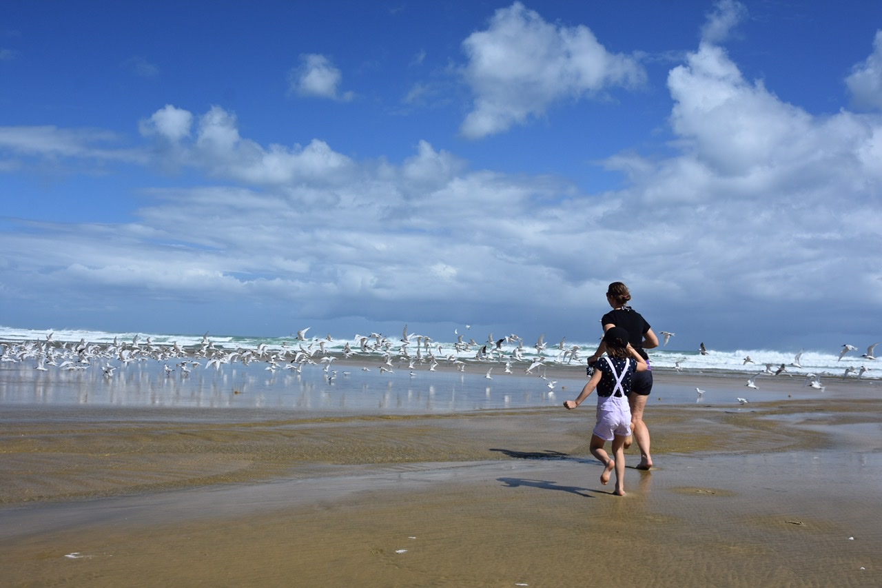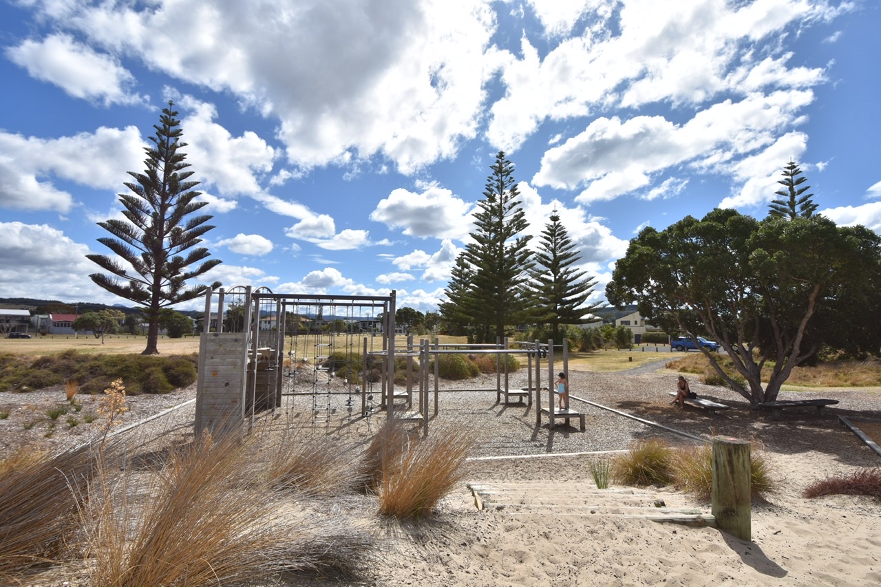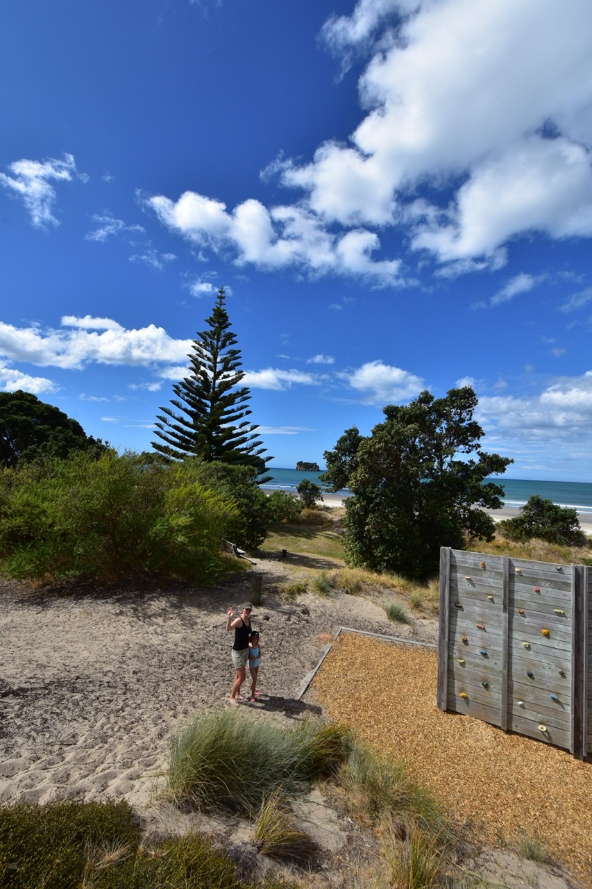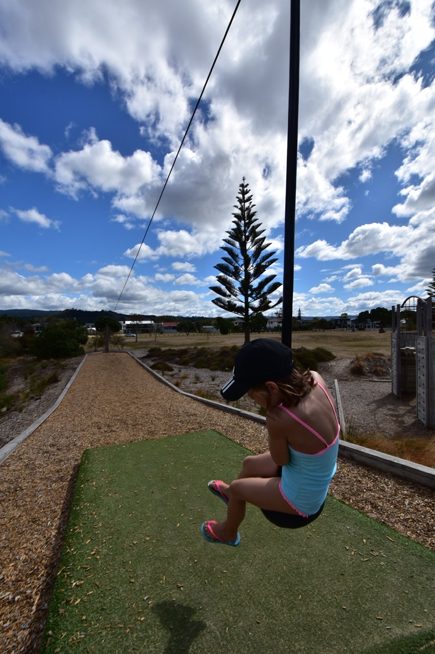 A surf hotspot with several small islands in front of the beach to please the eyes. Again the playground was huge and also entertaining for the bigger ones. We come across climbing and parcour elements, flying fox and shady trees (amongst these the iconic and beloved Norfolk Pine). All we could wish for.